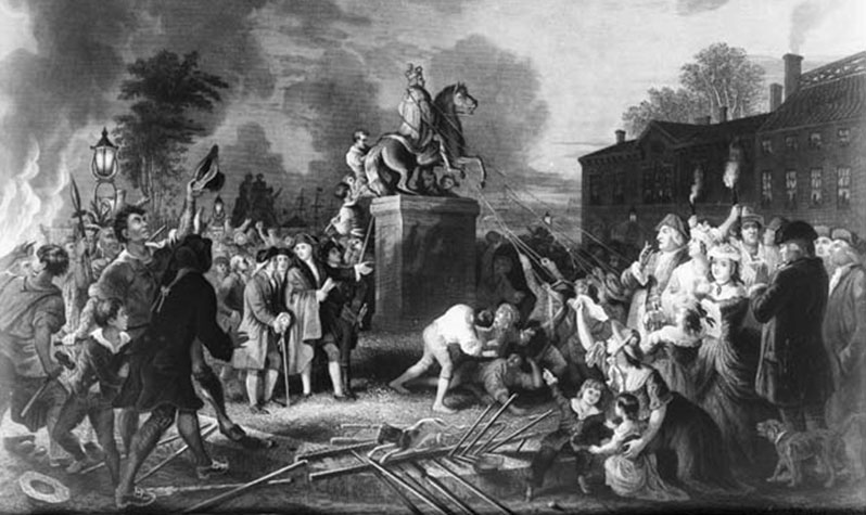 He was there in "the Fields", now City Hall Park, when the Declaration of Independence was read for the first time on July 9, 1776. A mob rushed to Bowling Green Park and toppled the statue of King George III. They hacked it to pieces and recast it as musket balls—the war wasn't over yet.