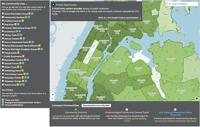 What aspects of a Vital Parks System matter most to you? Through our Vital Parks Explorer, you can check more than 20 different elements that matter most to New Yorkers. Learn more about access to these amenities across the city, your community, and even your block.