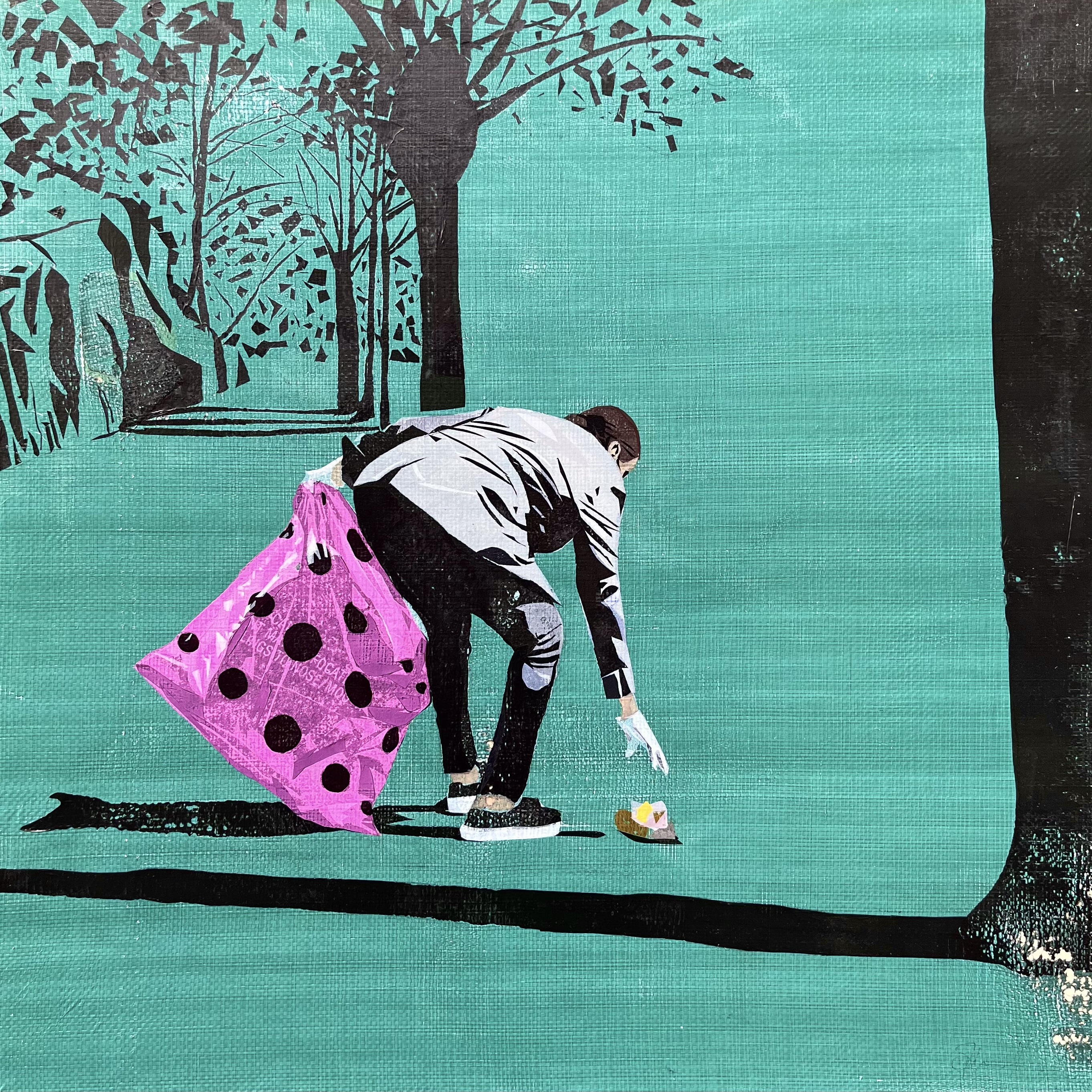 TRASH project is an exhibition of collaged artworks by New York City-based artist Adrian Kondratowicz. This body of work highlights community volunteerism and features a common motif: hot pink, polka-dotted trash bags. Kondratowicz first produced these eye-catching garbage bags in 2008, as an art project drawing attention to the large amount of trash that accumulates on city streets. Over time, the project evolved from a social art project into a series of monthly park cleanups in Manhattan's St. Nicholas Park, an extension of the artist's studio, and other public spaces around the world. Since 2020, the ubiquitous pink bags have found their way into Kondratowicz's collaged paintings, often featured alongside portraits of volunteers that mark the project's return to its artistic origins.
