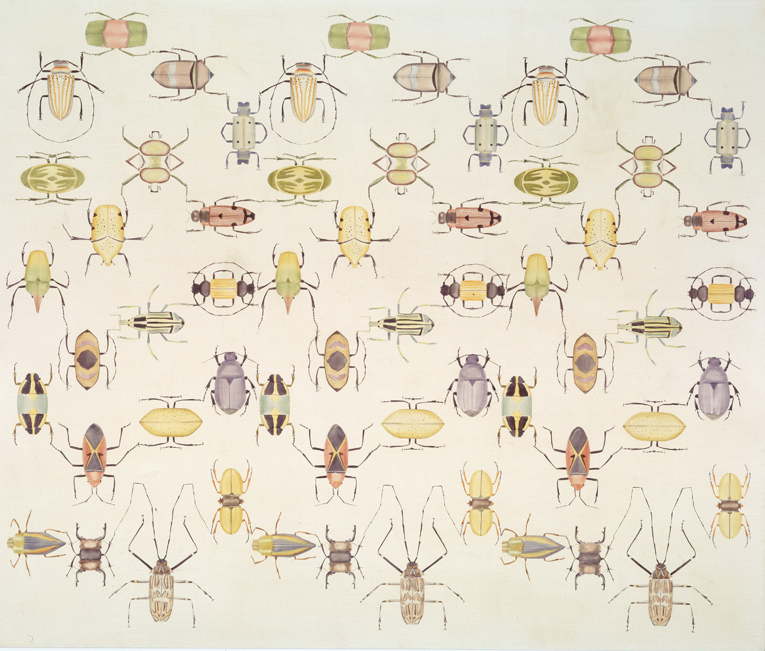 Located on Arsenal lawn, Brandon Ballengée’s outdoor light installation creates interactions between nocturnal arthropods and humans. In the gallery, Joianne Bittle’s Goliath Beetle is removed from his natural surroundings and placed on a gold background, referencing religious icons from the Byzantine era. A botanic wallpaper installation by Talia Greene is inhabited by a colony of weaver ants, illustrating our vain attempts to impose order on the natural world. Faux books and records designed by Julian Montague document the hypothetical history of pest control. In her videos, Julia Oldham translates insects’ behaviors into choreographed performances. Ben Snead paints insects in geometric patterns—a personal classification system based on aesthetics rather than science. Rebecca Clark, Emilie Clark, Asuka Hishiki, Lisa Murch, and Christy Rupp also present diverse artworks that herald insects as fascinating creatures to be studied, understood and celebrated.