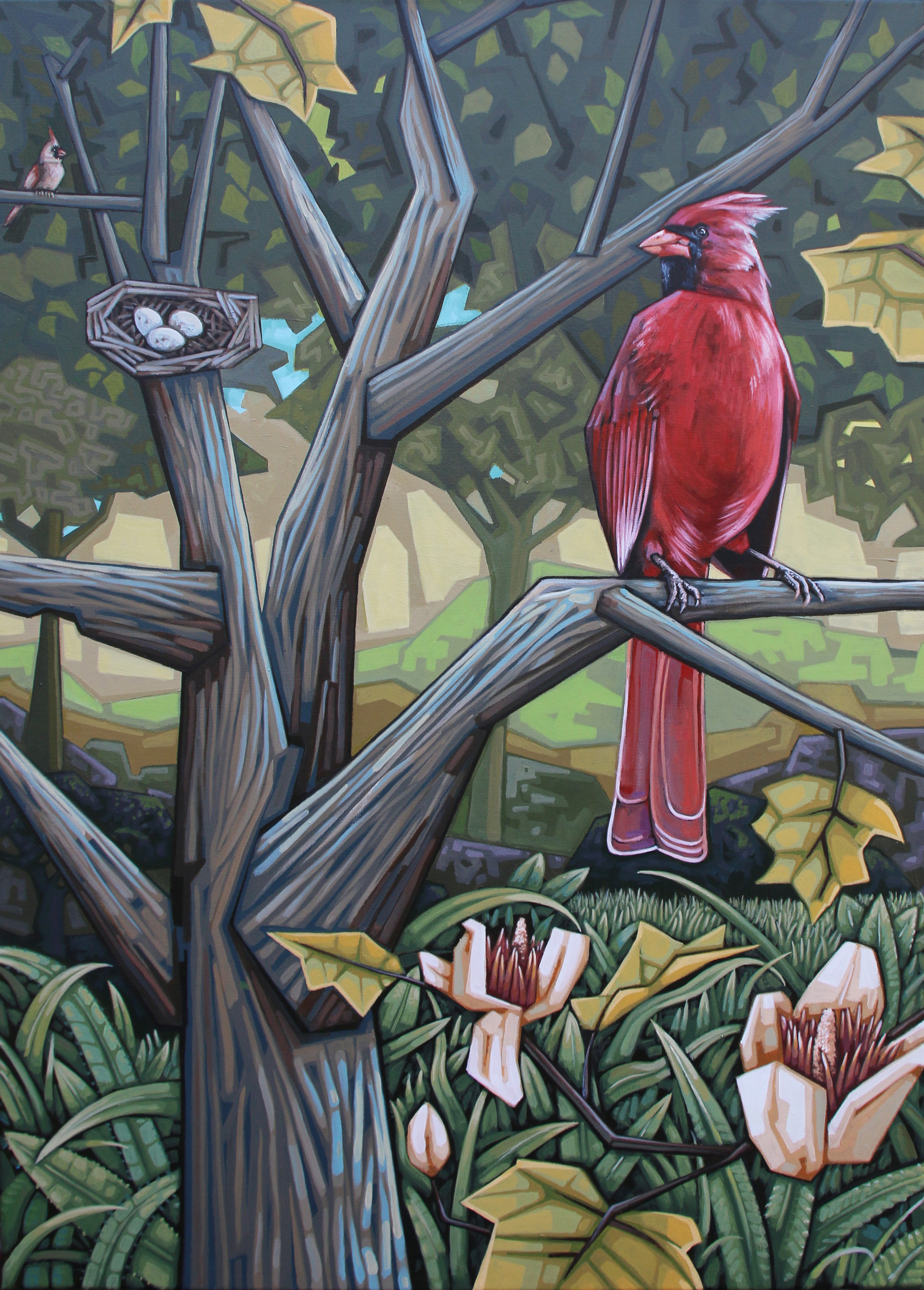 Image credit: Carlos Mateu, Nature with Cardinals, 2020, Acrylic on canvas.