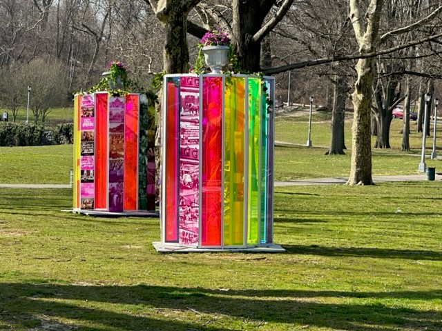 Lenticular Histories is based on the Praxinoscope and Zoetrope, 19th century devices of wonder that transform still photographs into moving images. Two seven-foot-tall rainbow-colored, luminous sculptures in the form of “eternal remembrance columns” are placed at the corner of Highland Boulevard and Jamaica Avenue in Lower Highland Park. The surface of the sculptures host colorful plexiglass panels and reflective mirrors adorned with historic photographs of Highland Park and the surrounding neighborhood. The photographs are interrupted by mirror panels that, when viewed from a distance, reflect back the park’s landscape and engage the viewer in an interactive moment of immersive optical intrigue and history.
