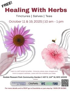 Learn to craft natural remedies—like tinctures, salves, and teas—using herbs that grow naturally in NYC in this 2-part series on October 11th & 19th. No prior experience needed!