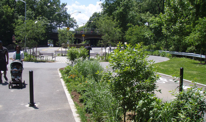 In 2012, we added a new entrance here at 211th Street in Shoelace Park. The entrance features sitting areas, plants and shrubs, bioswales (tiny green islands that trap run-off water), and improved signage to safely guide visitors to the park’s strip of the greenway—one of the best spots along the Bronx River for jogging, biking, and in-line skating.