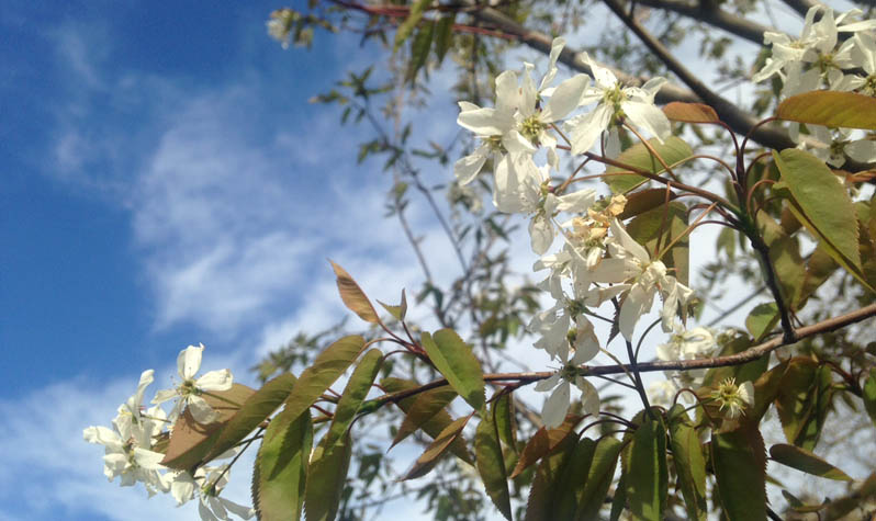 This tree or large shrub blooms white, sweet-smelling flowers. The petals are narrow and the leaves are heart-shaped to elliptical. The berries start off as green then change to a purplish-black color by summer. Use our new Street Tree Map to find serviceberry trees near you