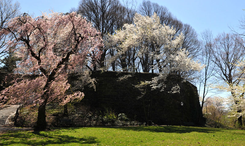 A weeping cherry tree (left) in Fort Tryon Park. (Photo by Daniel Avila/NYC Parks)