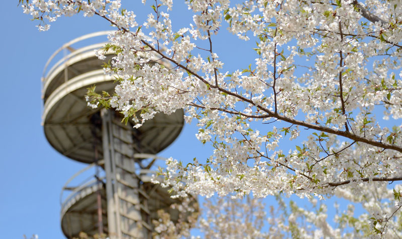 Yoshino cherry tree flowers near the observation towers at Flushing Meadows Corona Park. (Photo by Daniel Avila/NYC Parks)