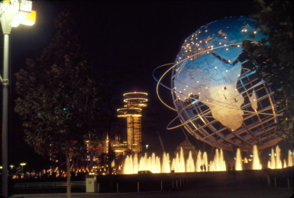 This picture was taken from the observation deck, looking north. In the foreground, in front of the Unisphere, is the New Jersey State Pavilion. The newly built Shea Stadium can be seen in the distant background.