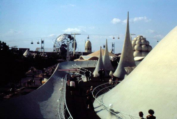 A view from inside the Eastman Kodak Pavilion, which had an undulating roof that was designed to provide a tempting backdrop for visitors' photos. The "bubble roof" of one of the many Brass Rail snack bars can be seen in the upper right hand corner.