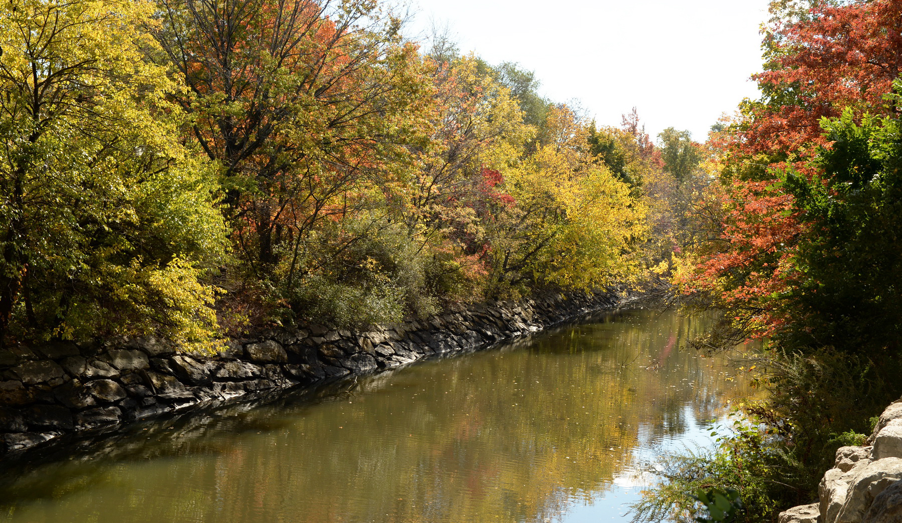 Suggested routes: There's no wrong place to go leaf-peeping in Inwood Hill Park, home to the only natural forest in Manhattan. But we do recommend the blue trail! The trail offers this view of the forest from the creek and leads up to the Overlook, which affords a gorgeous view of the Hudson River and the Palisades. View a map of Inwood Hill Park's trails