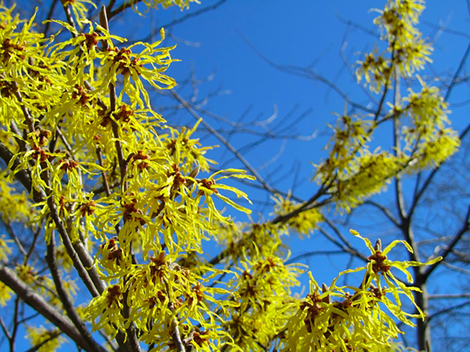 Keep an eye out for witch-hazel (Hamamelis virginiana), a native plant that blooms with yellow flowers as late as November, book-ending the winter season with its spring-blooming cousin, Hamamelis mollis. Witch hazel even has small brown nuts that provide food for wildlife.