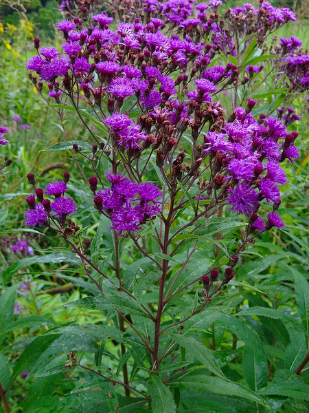New York ironweed (Vernonia noveboracensis) is a towering upright perennial wildflower that is native to the eastern and southeastern U.S. It is commonly found in areas with wet soil, like streambanks, low-lying woods, and marshes. It blooms in the late summer through early fall with fluffy, deep purple composite flowers, 3 to 4 inches wide, that cluster at the top of the plant above long, lance-shaped leaves.
