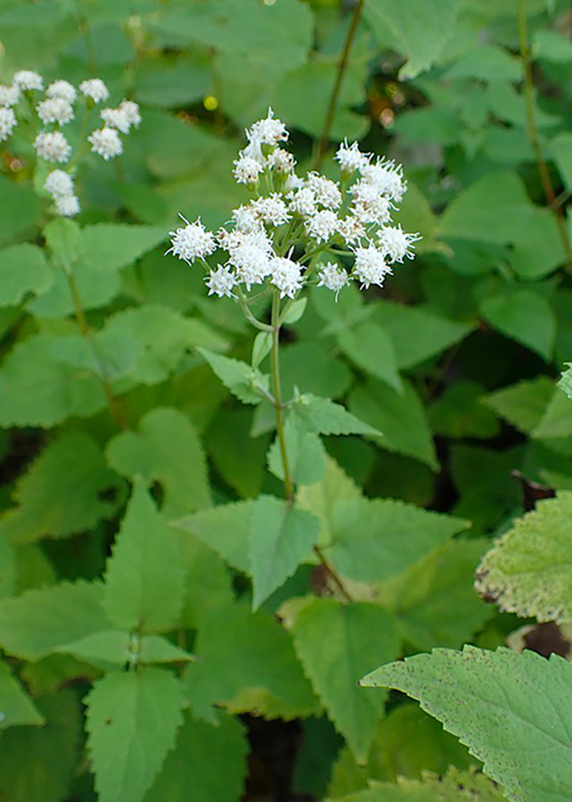 The common white snakeroot (Ageratina altissima) blooms from July to October, with white inflorescences (bunches of small flowers) visible throughout the fall. The nectar of these flowers attracts a variety of insects, including leaf-cutting bees, butterflies, wasps, and moths. The caterpillars of some moths, including Eupatorium Borer Moth (Carmenta bassiformis) and Ruby Tiger Moth (Phragmatobia fuliginosa), feed on the foliage of white snakeroot and related plants.