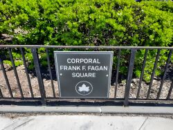 This square honors World War I veteran Corporal Frank Farrell Fagan, who was born on January 14, 1896 in Astoria, Queens and served with distinction in France during World War I. Broadway, Newtown Road, and 48th Street bound Fagan Square in the northwestern Queens neighborhood of Astoria. NYC Parks acquired the site by condemnation on June 18, 1915 and the square was named for Fagan by local law on May 3, 1932.