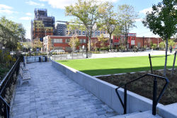 In 1996, the playground’s handball and basketball courts, play equipment, concrete play areas, benches, and other infrastructure were upgraded. The playground was reconstructed in 2020 through the Community Parks Initiative – a multi-faceted program to increase the accessibility and quality of parks throughout the five boroughs in an equitable manner. The redesign included a walkway connecting Grand Concourse with Walton Avenue, new seating and fitness areas, a water feature, two flex performance spaces, an elevated lawn with synthetic turf, table tennis, spray showers, and play features.