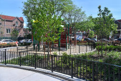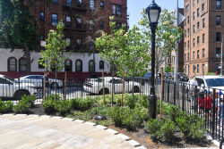 A New York City Art Commission Design Award was awarded to Krog and Tegnell Landscape Architects following their 1988 reconstruction of this triangle. What had once been little more than a paved traffic island was converted into a small, yet vibrant park. Their plans made full use of space, incorporating a memorial as well as various amenities for the community’s use. The Star of David, a universally recognized symbol of the Jewish faith, is inscribed within the center circle of the park. In its center, a bronze plaque commemorates the massacre of Babi Yar and bids visitors to remember the dead.