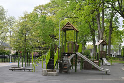 The City acquired this property in June 1925 by condemnation and it opened as a playground under the Parks Department in 1935. On June 10, 1969, Bowne Park made headlines as the first city park with an “instant playground.” This creation provided ready-made modular playground equipment which consisted of eight-sided colorful fiberglass play-cubes.