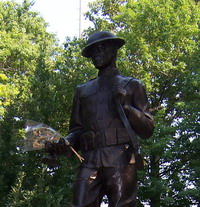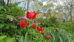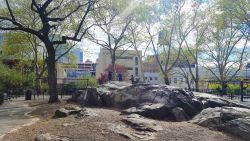 DeWitt Clinton Park, on Manhattan's west side, is a park filled with history and athletic adventure. In the Erie Canal Playground one can find play equipment, safety surfacing, painted games, swings, benches, drinking fountains, concrete play mules (named Sal, Pal and Gal) and a frog spray shower within the play area, and a dog run caters to the canine set. Maria's Perennial Garden features flowers of the 1800s, rock garden species, and plants that attract birds, bees and butterflies.
