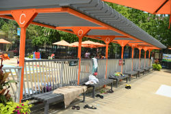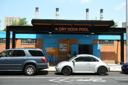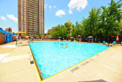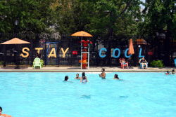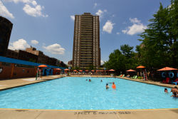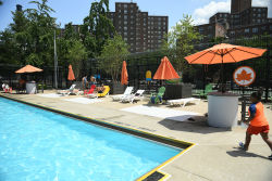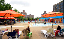 This small playground blooms in the summer, when its outdoor pool opens for splashing and swimming, and the basketball court fills up with the sound of dribbling and shooting. The play equipment is popular with children from the nearby school, who run over every afternoon to use the slide and other play equipment.