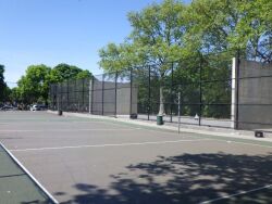 Grover Cleveland Playground has something to offer for Ridgewood residents and New Yorkers of all ages. The park behind Grover Cleveland High School offers tall play equipment, swings, and a spray shower shaped like a waterfall for kids. For older kids and adults, the park has basketball, handball, volleyball, and a synthetic field that can be used for soccer or baseball/softball. Lawns, plantings, and gently rolling hills complete the scene, making this park an attractive destination.