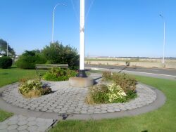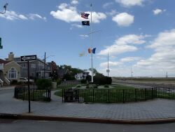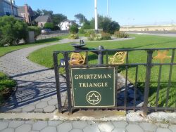 This triangle honors Leroy H. Gwirtzman, a World War II patriot and an active community member who contributed many years of dedicated service to this neighborhood. It features a flagpole, trees, shrubs, and perennials, as well as winding walkways and an iron fence with seashore animal art.