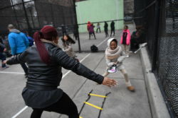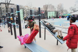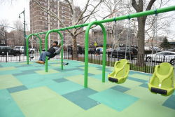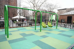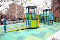 Harlem's Martin Luther King Jr. Playground is a state-of-the-art playground that has become the centerpiece of the neighborhood. The playground features play areas for a wide range of ages, a synthetic turf lawn for relaxation, two full-size basketball courts, and high-quality outdoor fitness equipment. The distinctive frog and lily pad shaped spray shower provides relief on hot days, and behind the scenes, rain gardens and pavers help capture stormwater to keep the park fresh.