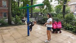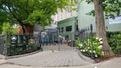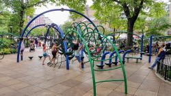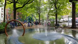 Calling all climbers! This small gated playground located at Minetta Lane and 6th Avenue features an array of climbable play equipment perfect for younger kids, as well as a pair of low swings and a summer spray shower for use on hot days.