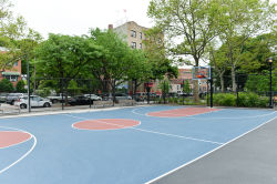 Saw Mill Playground is named for the Saw Mill Creek. The park features handball and basketball courts, play areas, youth fitness equipment, a synthetic turf field and a multi-purpose area as well as a painted track and spray showers.