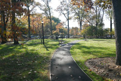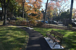 Originally called the Public Burial Ground, this site is the final resting place for roughly one thousand people, mostly of Native American and African American descent. A reflective memorial area honors the site's history with a commemorative wall engraved with the names of 320 people that were identified, with room for additional names that may be discovered. Plaques on the face of the wall represent the four original marble headstones found in 1919. The plaza holds a butterfly garden with seating, giving the space a feeling of peace and tranquility. A playground, placed on a sill system foundation so as not to disturb the land, is accessible from the 165th Street entrance, and offers play equipment for young children.