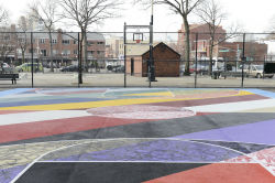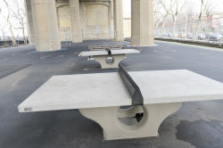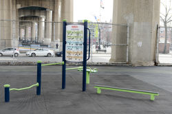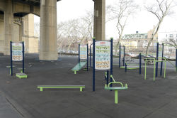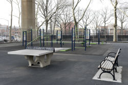 This large playground is part of a chain of under the RFK Bridge extending from Astoria Park, and is particularly great for adult athletes. The basketball court in this park is decorated with a bright and colorful mural designed by artist Mark Paul Deren, aka MADSTEEZ, and the soccer field was built with support from New York City Football Club. The children's playground nearby also features an adult play area with fitness equipment and ping pong tables.