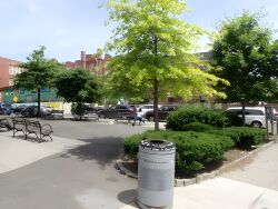 This small park located between Grote Street and Garden Street in Belmont offers pedestrians and park goers a place to sit and relax. In the center of the plaza, two rows of benches face each other under the shade of a grove of trees.