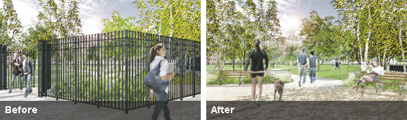 Through Parks Without Borders, we're reimagining the role of parks in communities by redesigning where they meet the streets and sidewalks. As part of OneNYC, Mayor Bill de Blasio has dedicated $50 million to the program to: