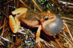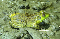 American bullfrogs are the largest frogs in North America. They live in freshwater lakes, ponds, and slow-moving streams. Female bullfrogs lay tens of thousands of eggs from June through August. The eggs hatch into tadpoles within a week, and can remain that way for one to three years depending upon the conditions of their home. When mating, the male attracts the females with a deep vocalization that sounds like “jug-o-rum.”