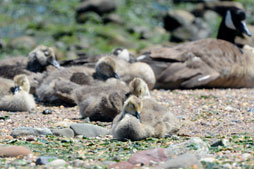 Canada geese breed in March, and their chicks begin hatching in May. If you visit NYC's shorefront parks, ponds, and lakes during this time, you might see some yellow-green goslings paddling through the water with their parents, with one parent leading the way and the other parent following closely behind. The young leave the family after one year.