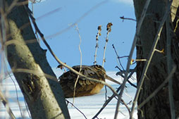 Woodcocks are also called timberdoodles. The presence of woodcocks in our woodland areas in March is a sign that their spring migration to the north has begun—and a sign that spring migration for many other birds will start soon! Woodcocks stay close to the ground, and are slightly camouflaged, but if you look closely you can sometimes see them walking around the forest floor and poking their long bills in the soil in search of earthworms to eat. In the springtime, woodcocks perform aerial displays of courtship—males will fly upward in wide spirals, then zig-zag down to land near the females.
